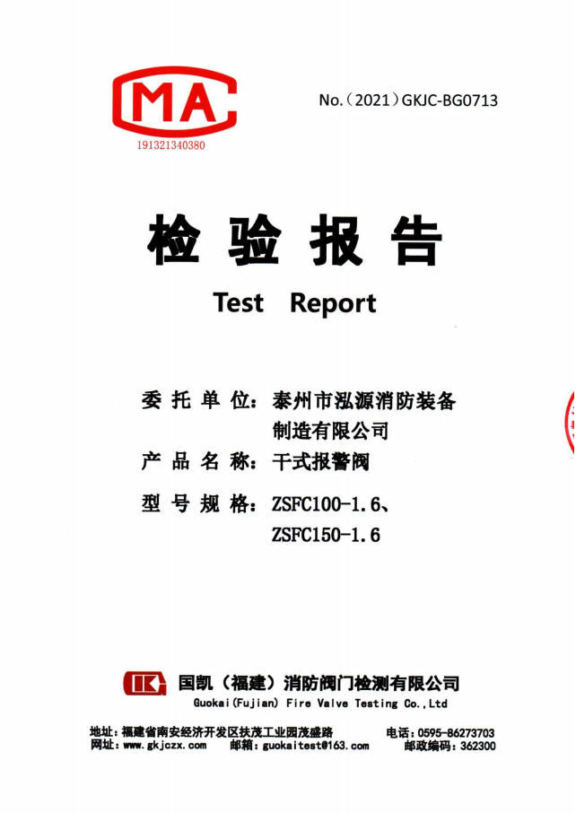 啟真干式報(bào)警閥ZSFC檢驗(yàn)報(bào)告